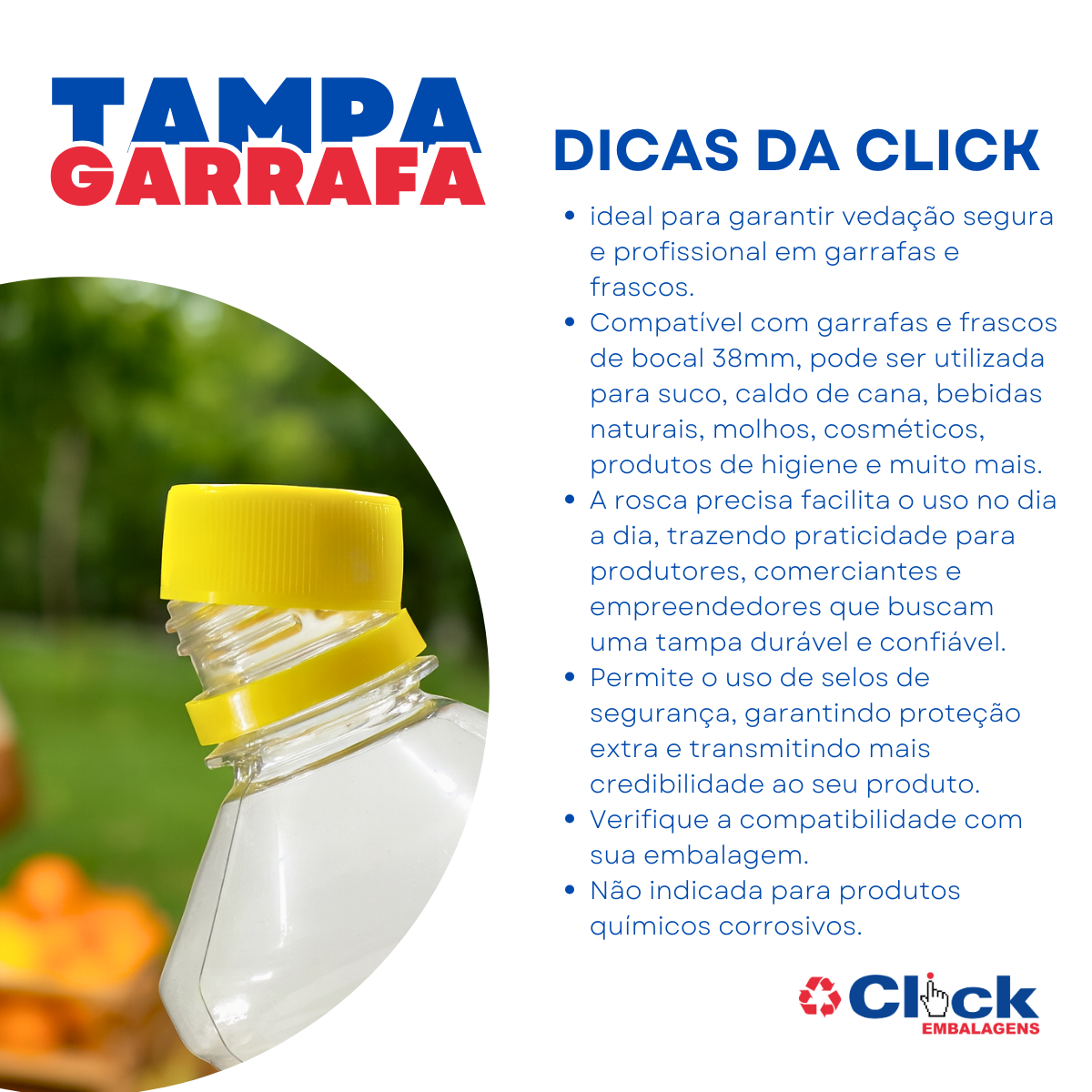 Compatível com garrafas e frascos de bocal 38mm. pode ser utilizada para suco. caldo de cana. bebidas naturais. molhos. cosméticos. produtos de higiene e muito mais. A rosca precisa facilita o uso no dia a dia. trazendo praticidade para produtores. comerciantes e empreendedores que buscam uma tampa durável e confiável.